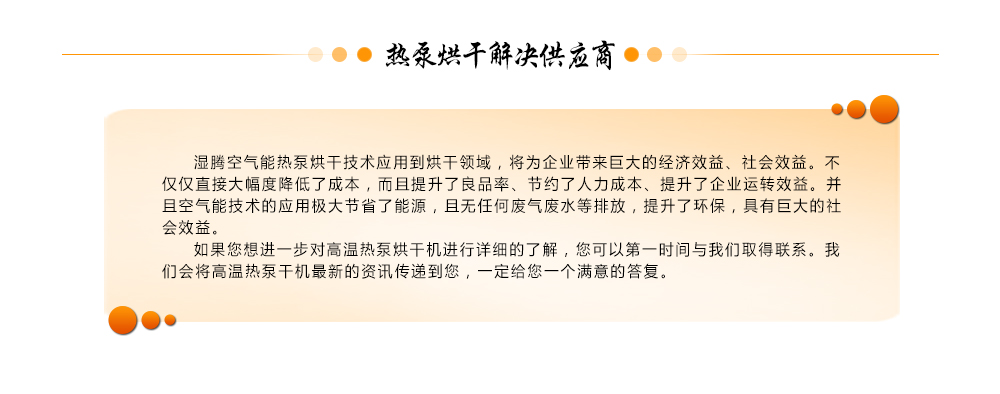 熱泵烘干機是一種新型高效率節能烘干機,其工作原理是根據逆卡諾循環原理,采用少量的電能,利用壓縮機,將工質經過膨脹閥后在蒸發器內蒸發為氣態,并大量 吸收空氣中的熱能,氣態的工質被壓縮機壓縮成為高溫、高壓的氣體,然后進入冷凝器放熱,把干燥介質加熱,如此不斷循環加熱,可以把干燥介質加熱至 40℃~85℃。相對于電熱烘干機而言,節約了三分之二的電能。