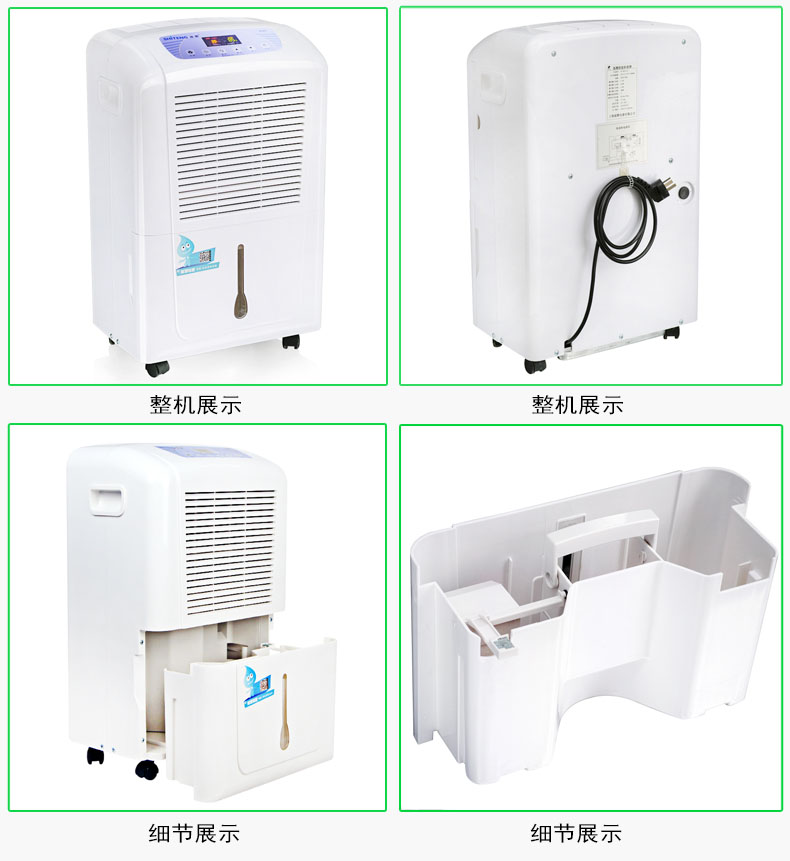 1、整機結構合理:采用“智能風機延遲關閉”系統,濕度設定,自動控制。機器帶濕度及溫度顯示,濕度從30%—90%之間設定,達到設定的濕度時會自動停機,高于設定濕度時會自動開機除濕(設定好濕度后,機器會自動感應空氣,潮濕時自動開機,空氣干燥時自動關機,實現自動化控制)